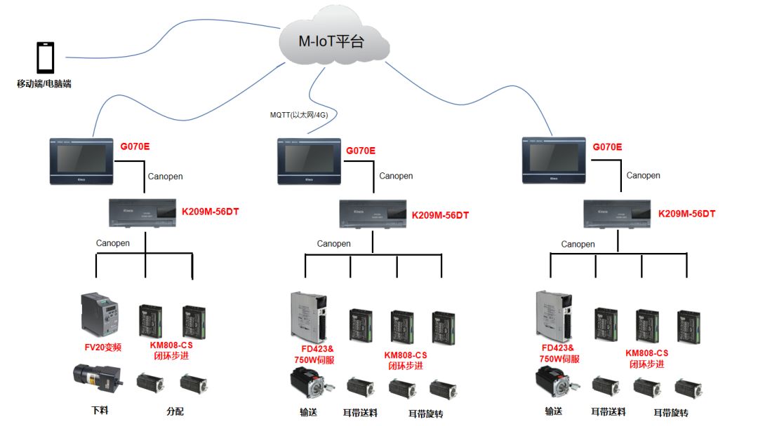 客戶和設(shè)備商擔(dān)心的就是設(shè)備故障停機(jī),升級(jí)版口罩機(jī)Plus方案通過互聯(lián)網(wǎng)或4G將整套設(shè)備接入云端的M-IoT平臺(tái),讓設(shè)備上云,足不出戶就可實(shí)現(xiàn)設(shè)備遠(yuǎn)程診斷,實(shí)現(xiàn)故障及時(shí)排查與預(yù)防性維護(hù)。通過對驅(qū)動(dòng)器、電機(jī)、變頻器、PLC、HMI的運(yùn)行數(shù)據(jù)采集,完成對設(shè)備運(yùn)行健康狀態(tài)的監(jiān)控。