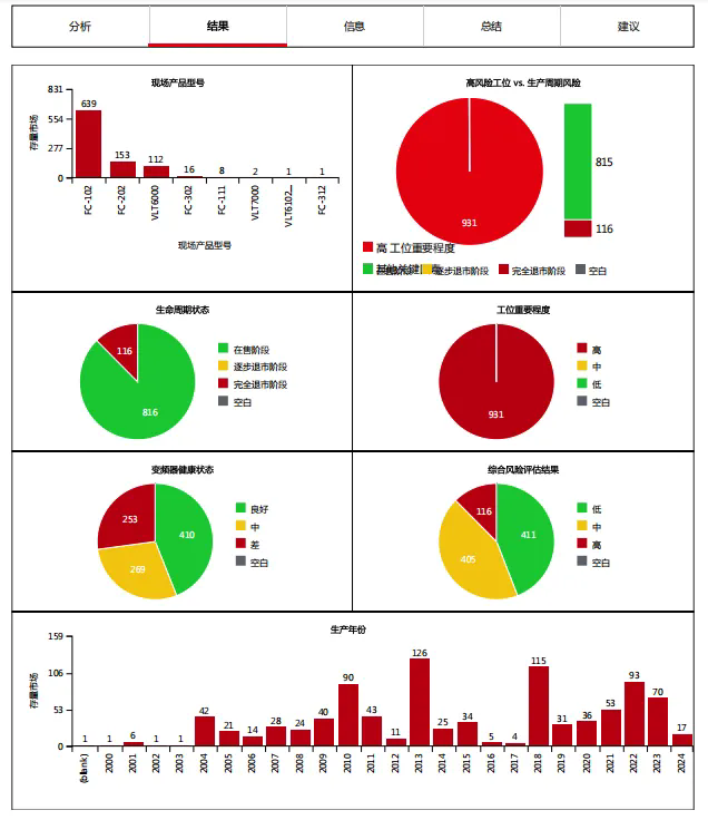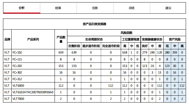 丹佛斯工程師帶領(lǐng)團隊,現(xiàn)場推進評估工作。依據(jù)現(xiàn)場評估所獲取的數(shù)據(jù)信息可知,當(dāng)前該熱力公司在用的變頻器以丹佛斯FC102和FC202機型為主,有少量FC302和FC111機型,其中112臺已退市的VLT6000機型仍在使用,445臺變頻器已使用超過10年,253臺變頻器健康狀態(tài)較差。此次現(xiàn)場評估工作從變頻器健康狀態(tài)、生命周期、工位重要程度三個維度進行了分析,幫助客戶梳理變頻器臺賬,排查故障,為后續(xù)的設(shè)備維保改造與預(yù)算制定計劃提供了依據(jù)。