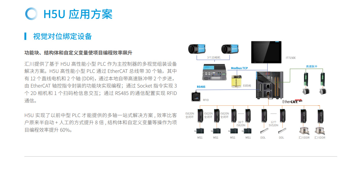 匯川技術(shù)推出首個(gè)應(yīng)用EtherCAT 總線的小型PLC H5U,讓線體設(shè)備飛速運(yùn)轉(zhuǎn)。隨著終端消費(fèi)日趨升級(jí),生產(chǎn)制造面臨巨大的壓力,而H5U 能夠簡化布線量、加快編程調(diào)試時(shí)間、滿足帶軸能力的要求以及嚴(yán)苛的成本控制需求,從容應(yīng)對嚴(yán)峻的挑戰(zhàn),是將EtherCAT總線應(yīng)用到小型PLC 的先鋒之作。