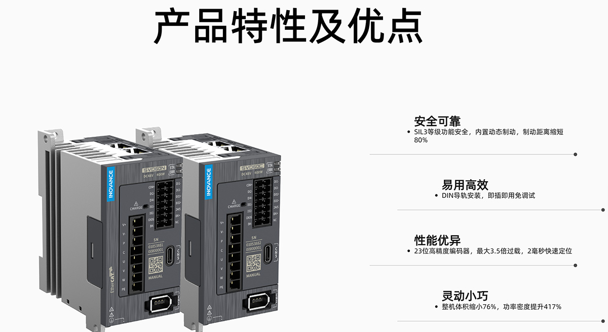 SVD60系列伺服驅動器是匯川技術研制的一款低壓直流伺服平臺,產品功率范圍為0.2kW~0.75kW,支持CANopen和EtherCAT控制方式,配合上位機可實現(xiàn)多臺伺服驅動器聯(lián)網(wǎng)運行。 該系列伺服適用于物流、醫(yī)藥、電子制造、鋰電、汽車、機床等行業(yè)的自動化設備,以小體積,高性能,更安全通用方案實現(xiàn)快速精確的位置控制、速度控制和轉矩控制。